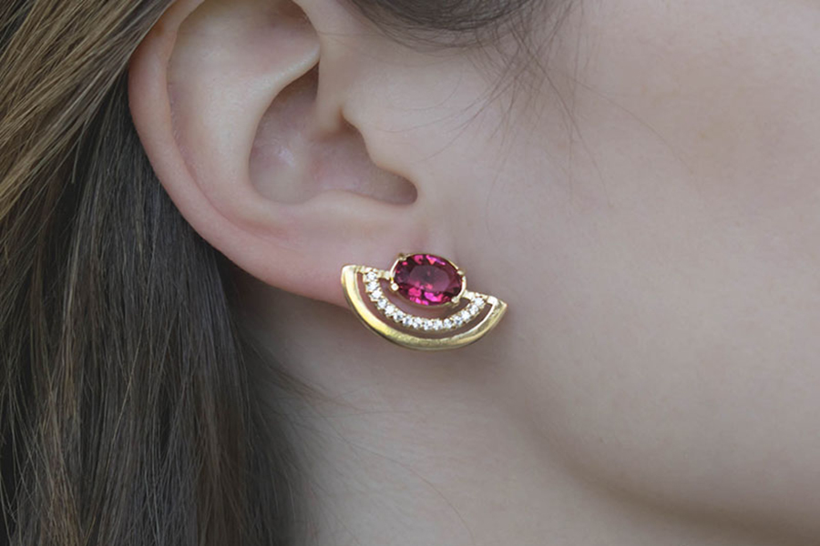 BRINCO BANHADO EM OURO, FIOS CRUZADO, COM PARTE INFERIOR E BASE CRAVEJADOS