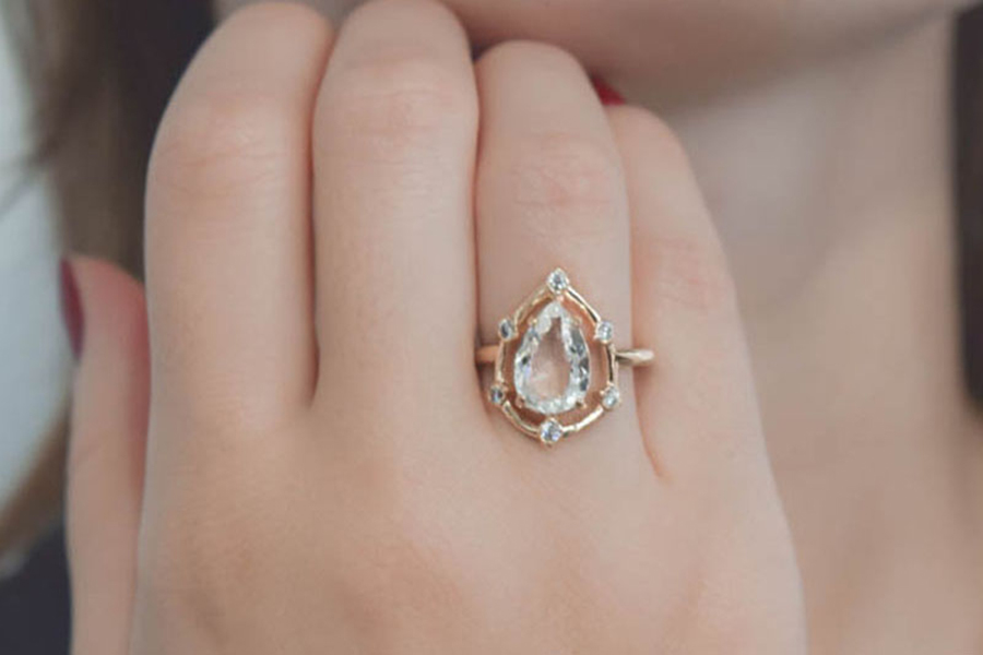 ANEL BANHADO EM OURO, CRISTAL, GOTA 18x13mm