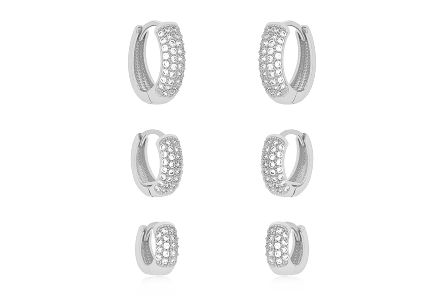 CONJUNTO BANHADO EM RÓDIO BRANCO, TRIO DE BRINCOS PONTO DE LUZ 5, 4 E 3mm