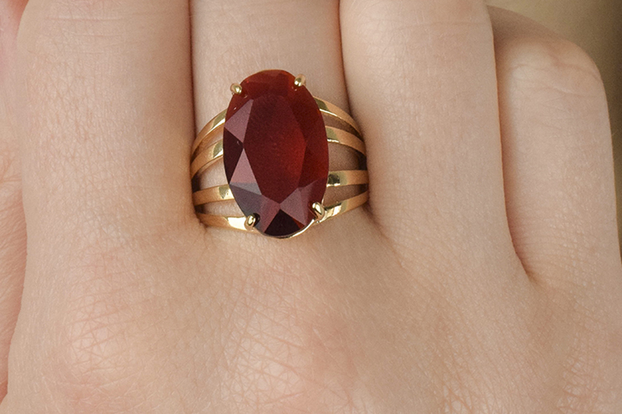 ANEL BANHADO EM OURO, MASCULINO, PEDRA 8mm PRETA OU VERMELHA