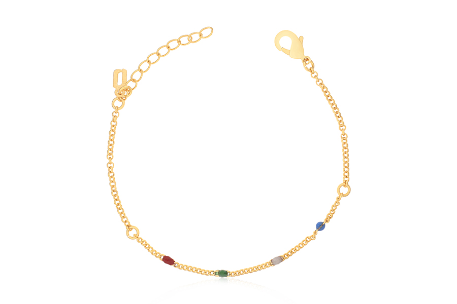 PULSEIRA INFANTIL BANHADA EM OURO, ELO 1,10mm COM BOLINHA, 14cm COMPRIMENTO, PONTO DE LUZ 3,50mm, AMOR DA DINDA 10mm COM CORAÇÃO