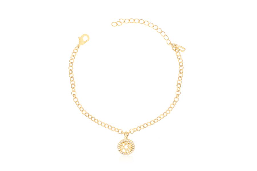 PULSEIRA BANHADA EM OURO, ELO PORTUGUÊS 2,50mm, 16cm COMPRIMENTO, PONTO DE LUZ 4,50mm E PINGENTE PAZ 11mm DIÂMETRO