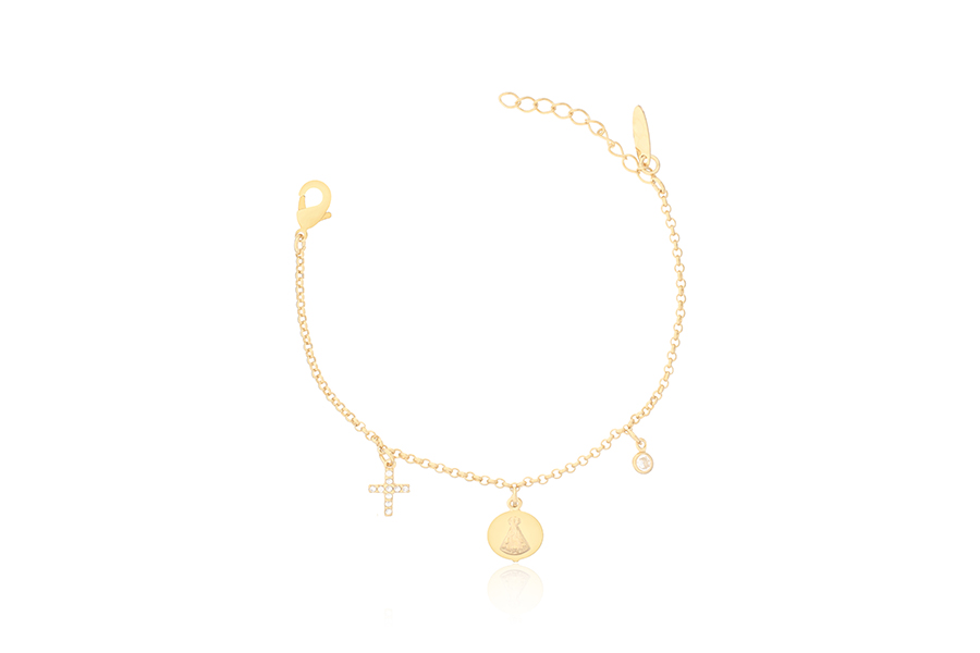 PULSEIRA INFANTIL BANHADA EM OURO, ELO DUPLO 1,80mm E CARTIER 3,50x1,90mm, 15cm COMPRIMENTO, CORAÇÃO, ANJO E CHAVE