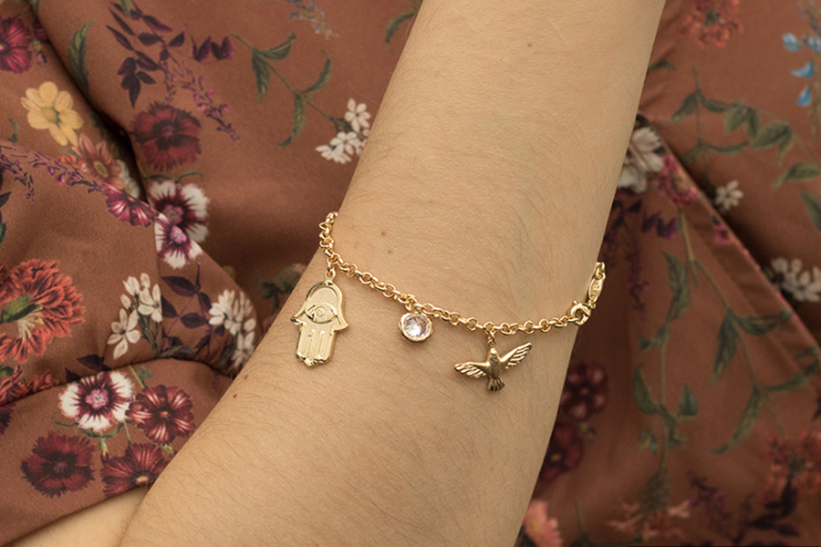 PULSEIRA INFANTIL BANHADA EM OURO, ELO DUPLO 1,80mm E CARTIER 3,50x1,90mm, 15cm COMPRIMENTO, CORAÇÃO, ANJO E CHAVE