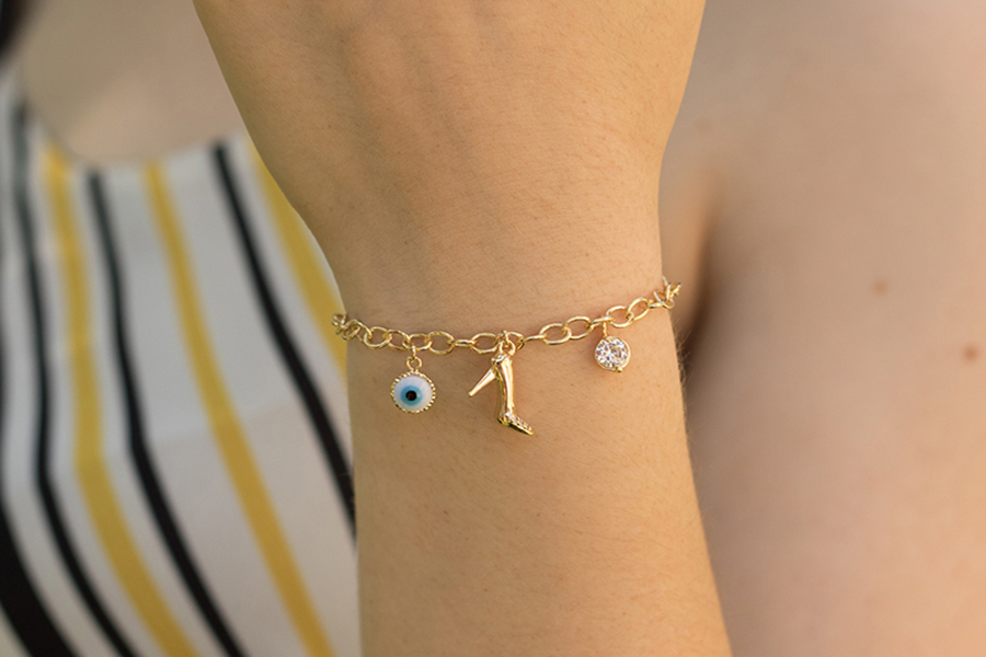 PULSEIRA INFANTIL BANHADA EM OURO, ELO DUPLO 1,80mm E CARTIER 3,50x1,90mm, 15cm COMPRIMENTO, CORAÇÃO, ANJO E CHAVE
