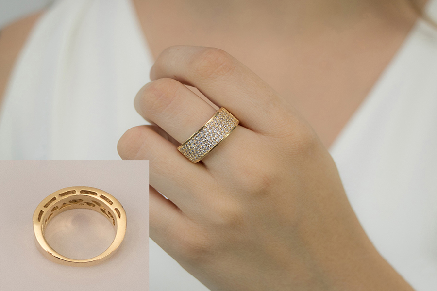 ANEL BANHADO EM OURO, APARADOR DUPLO, COM 2 FILEIRAS DE ZIRCÔNIAS CADA