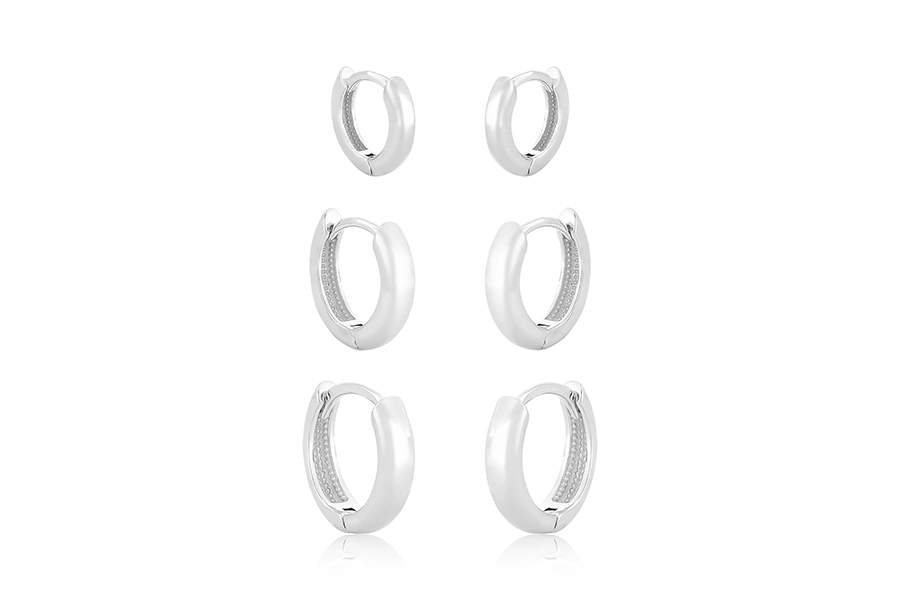 CONJUNTO BANHADO EM RÓDIO BRANCO, TRIO DE BRINCOS DE ARGOLINHAS LISAS 12, 15 E 17mm
