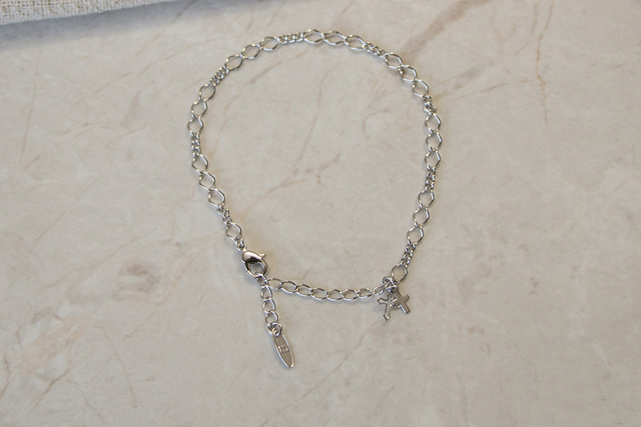PULSEIRA BANHADA EM RÓDIO BRANCO, ELO PORTUGUÊS 2,50mm, 16cm COMPRIMENTO, E PONTO DE LUZ 4,50mm E PINGENTE FÉ 11mm DIÂMETRO