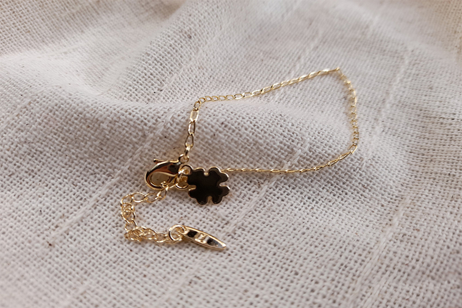 PULSEIRA INFANTIL BANHADA EM OURO, ELO DUPLO 1,80mm E CARTIER 3,50x1,90mm, 15cm COMPRIMENTO, CORAÇÃO, ANJO E CHAVE