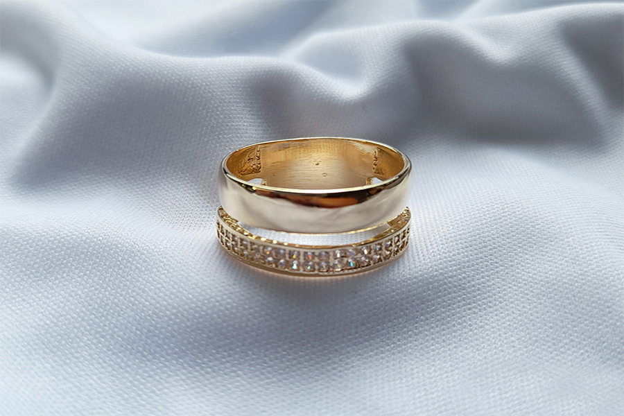 ANEL BANHADO EM OURO, APARADOR DUPLO, COM 2 FILEIRAS DE ZIRCÔNIAS CADA