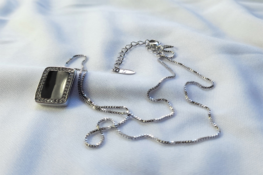 GARGANTILHA BANHADA EM RÓDIO BRANCO, RABO DE RATO 1mm, 40cm COMPRIMENTO, EXTENSOR 5cm COMPRIMENTO E PINGENTE 10x6mm, COLEÇÃO ATENA