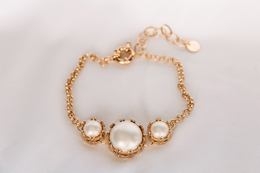 PULSEIRA BANHADO EM OURO, ELO PORTUGUÊS 1,80 E 5mm COM PÉROLAS SHELL 8, 6 E 4mm, 17cm COMPRIMENTO