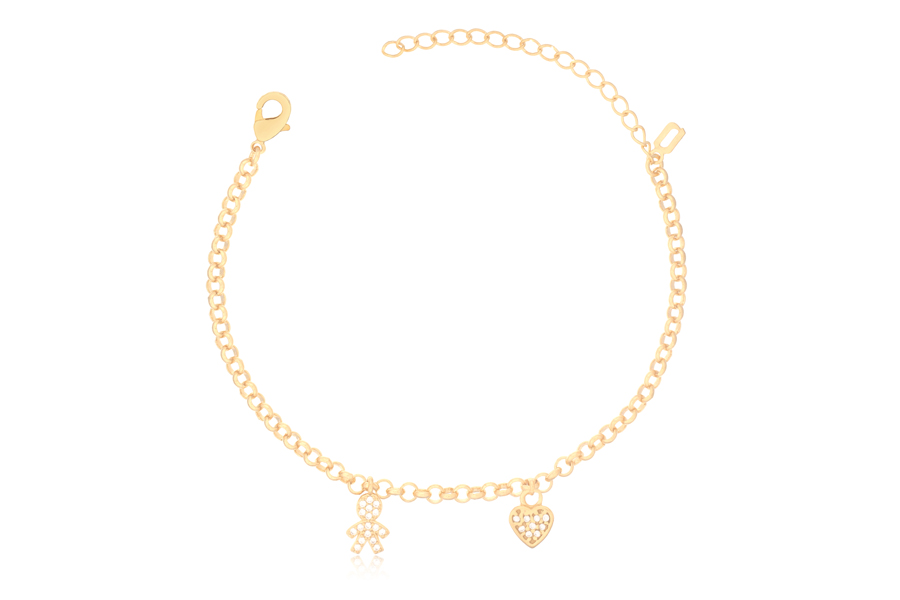 PULSEIRA INFANTIL BANHADA EM OURO, ELO 1,10mm COM BOLINHA, 14cm COMPRIMENTO, PONTO DE LUZ 3,50mm, AMOR DA DINDA 10mm COM CORAÇÃO