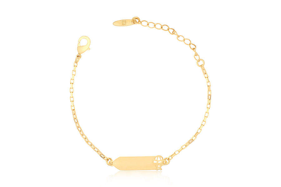 PULSEIRA BANHADA EM OURO, INFANTIL, MELINDROSA, ELO VENEZIANA LONGA 1,50mm ESPESSURA, CHAPINHA COM MENINO 24mm COMPRIMENTO E EXTENSOR 3,50cm COMPRIMENTO