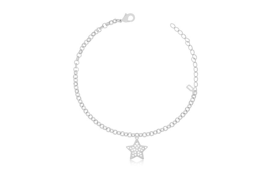 PULSEIRA BANHADA EM RÓDIO BRANCO, ELO PORTUGUÊS 5mm DIÂMETRO, 16cm COMPRIMENTO, EXTENSOR 5cm COMPRIMENTO E PONTO DE LUZ 8mm