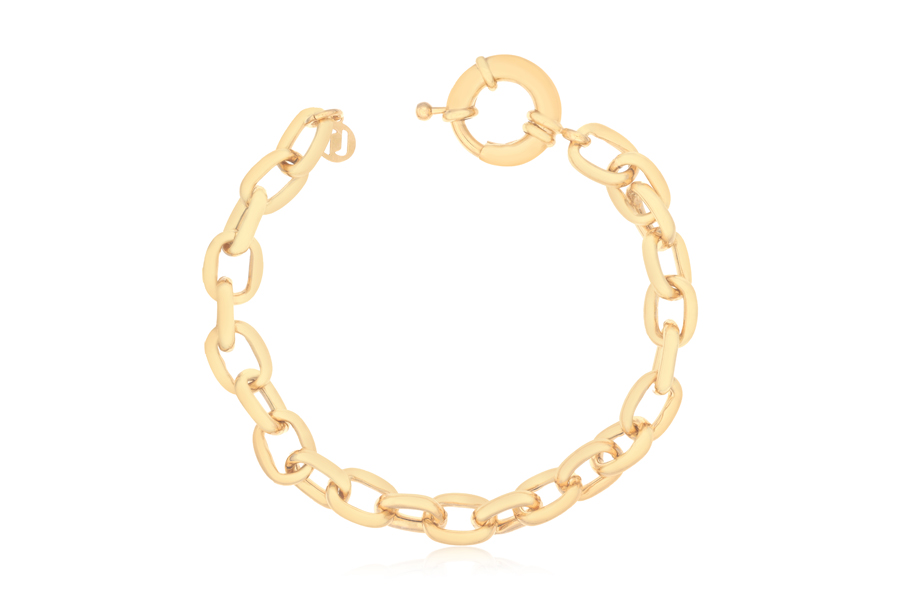 PULSEIRA BANHADA EM OURO, ELO PORTUGUÊS 7mm DIÂMETRO, 2,50mm ESPESSURA E BOLSA 19mm LARGURA
