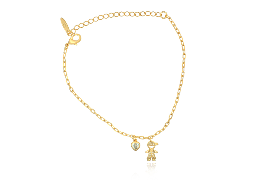 PULSEIRA BANHADA EM OURO, ELO PORTUGUÊS 3mm, ELO CORAÇÃO 4,20mm LARGURA, PINGENTE CORAÇÃO 11mm LARGURA COM MENINA