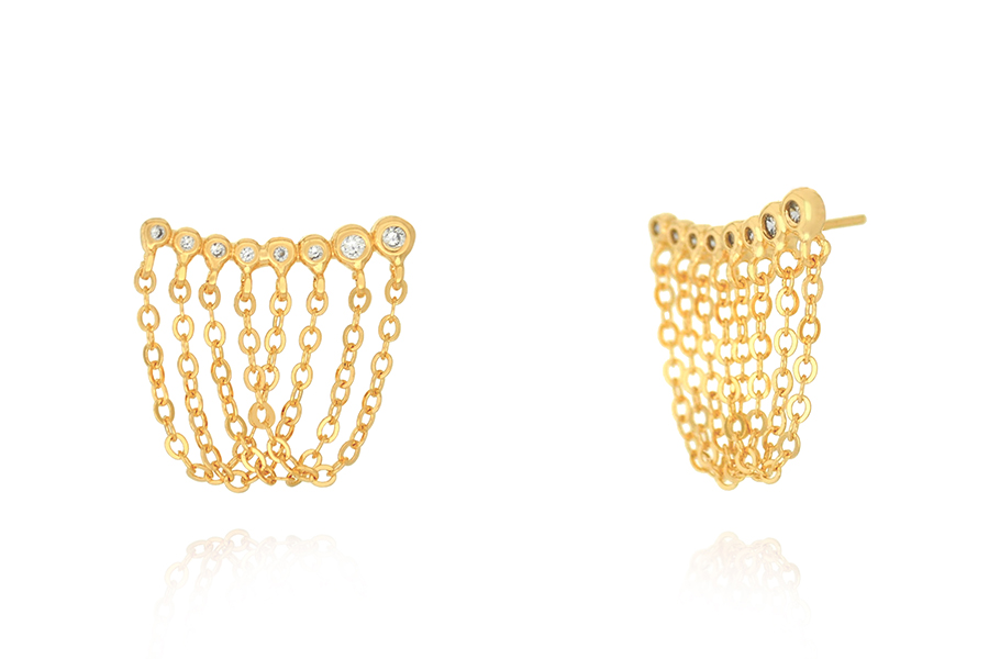 BRINCO BANHADO EM OURO, FIOS CRUZADO, COM PARTE INFERIOR E BASE CRAVEJADOS