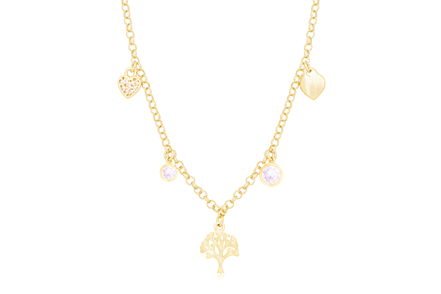 GARGANTILHA BANHADA EM OURO, CRISTAL CORAÇÃO 15mm LARGURA E CORRENTE ELO 4mm LARGURA, 40cm COMPRIMENTO