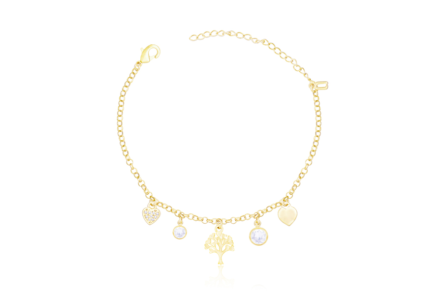 PULSEIRA INFANTIL BANHADA EM OURO, ELO DUPLO 1,80mm E CARTIER 3,50x1,90mm, 15cm COMPRIMENTO, CORAÇÃO, ANJO E CHAVE