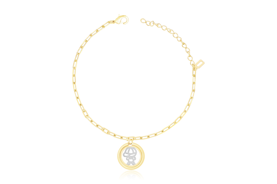 PULSEIRA BANHADA EM OURO, INFANTIL, MELINDROSA, ELO VENEZIANA LONGA 1,50mm ESPESSURA, CHAPINHA COM MENINO 24mm COMPRIMENTO E EXTENSOR 3,50cm COMPRIMENTO