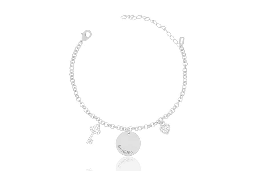 PULSEIRA BANHADA EM RÓDIO BRANCO, ELO PORTUGUÊS 3mm, 16cm COMPRIMENTO E PINGENTE ''FOREVER AND ALWAYS'' 17,50mm DIÂMETRO