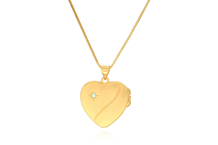 CHOKER BANHADA EM OURO, ELO 1,50mm, 37cm COMPRIMENTO, ZIRCÔNIA 4,50mm E MEDALHA CORAÇÃO 15mm DIÂMETRO