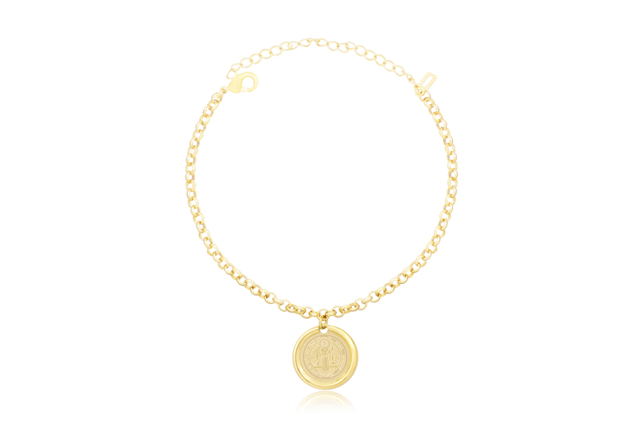 PULSEIRA BANHADA EM OURO, ELO 5mm LARGURA, 18cm COMPRIMENTO E MEDALHA PAI NOSSO 26mm DIÂMETRO