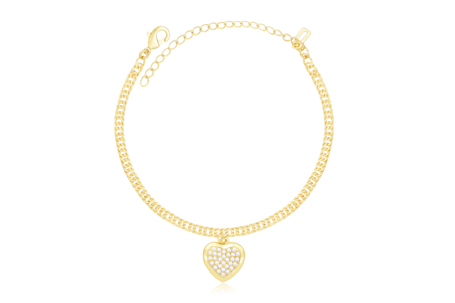 PULSEIRA INFANTIL BANHADA EM OURO, ELO 1,10mm COM BOLINHA, 14cm COMPRIMENTO, PONTO DE LUZ 3,50mm, AMOR DA DINDA 10mm COM CORAÇÃO