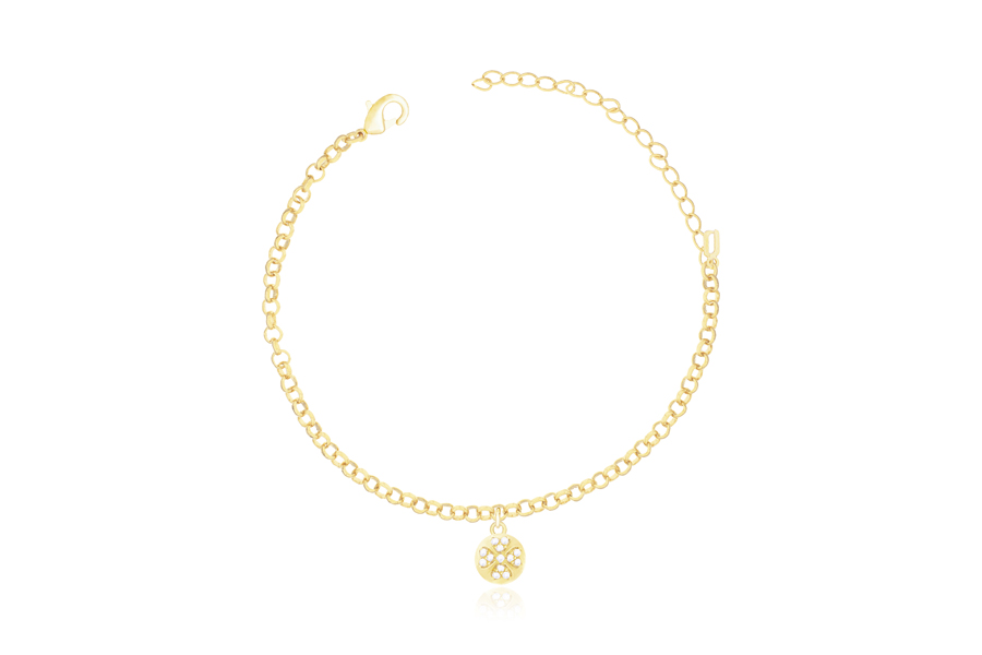 PULSEIRA BANHADA EM OURO, ELO PORTUGUÊS 2,50mm, 16cm COMPRIMENTO, PONTO DE LUZ 4,50mm E PINGENTE PAZ 11mm DIÂMETRO