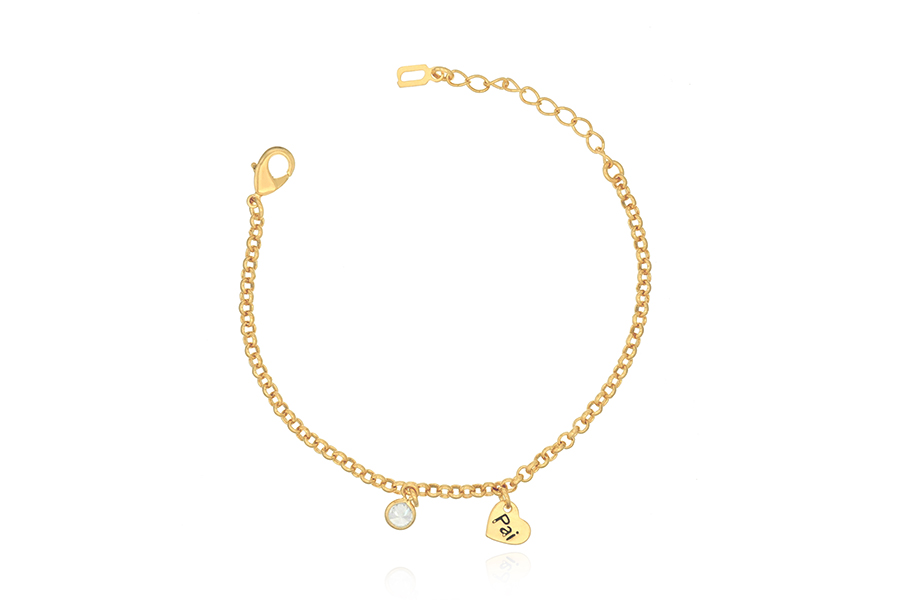 PULSEIRA INFANTIL BANHADA EM OURO, ELO 1,10mm COM BOLINHA, 14cm COMPRIMENTO, PONTO DE LUZ 3,50mm, AMOR DO PAPAI 10mm COM CORAÇÃO