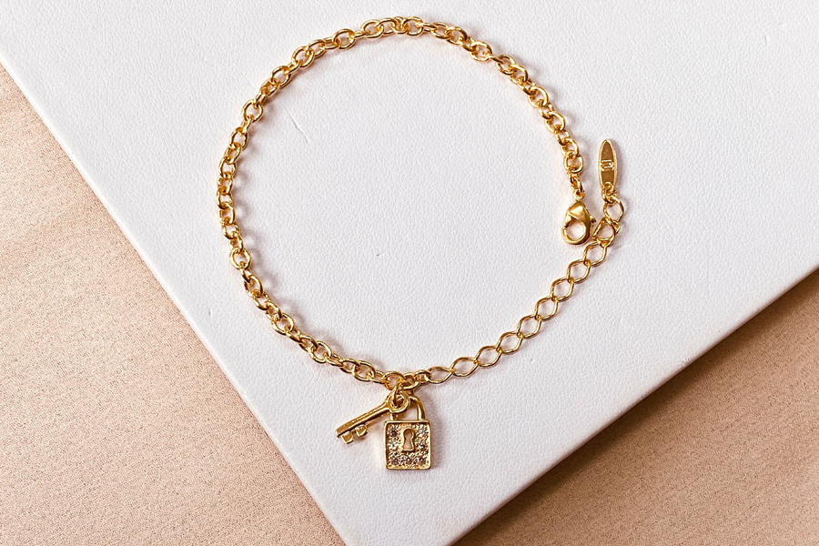 PULSEIRA INFANTIL BANHADA EM OURO, ELO DUPLO 1,80mm E CARTIER 3,50x1,90mm, 15cm COMPRIMENTO, CORAÇÃO, ANJO E CHAVE