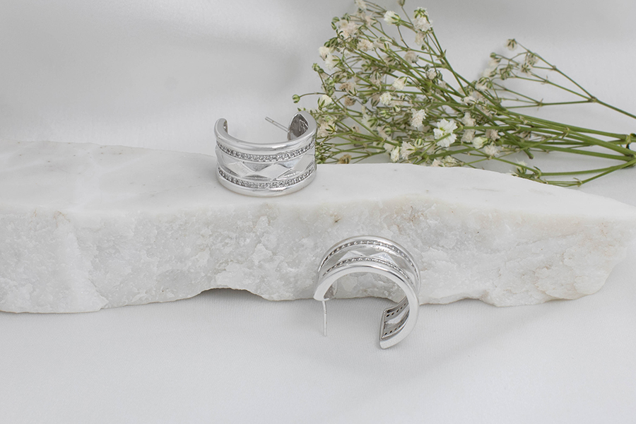 BRINCO EM PRATA, CURVADO COM 1 FIO CRAVEJADO E 2 LISOS