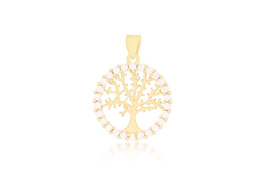PINGENTE BANHADO EM OURO, CRISTAL REDONDO 26mm, ÁRVORE DA VIDA