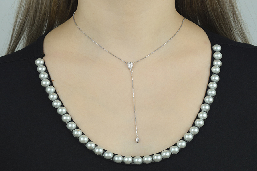 GARGANTILHA BANHADA EM RÓDIO BRANCO, ELO VENEZIANA 0,80mm, 40cm COMPRIMENTO, EXTENSOR 5cm COMPRIMENTO E PINGENTE SOJA COM PÉROLAS SHELL 3mm