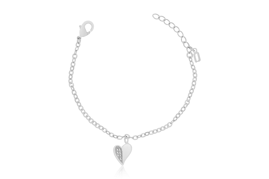 PULSEIRA BANHADA EM RÓDIO BRANCO, ELO CARTIER 5,10x1,90mm, 17cm COMPRIMENTO, EXTENSOR 5cm COMPRIMENTO E PINGENTE 14mm DIÂMETRO COM CORAÇÃO DE ZIRCÔNIA