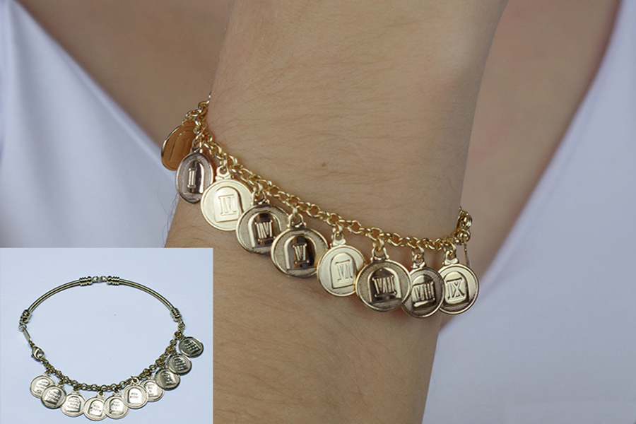 PULSEIRA INFANTIL BANHADA EM OURO, ELO DUPLO 1,80mm E CARTIER 3,50x1,90mm, 15cm COMPRIMENTO, CORAÇAO, ANJO E CHAVE