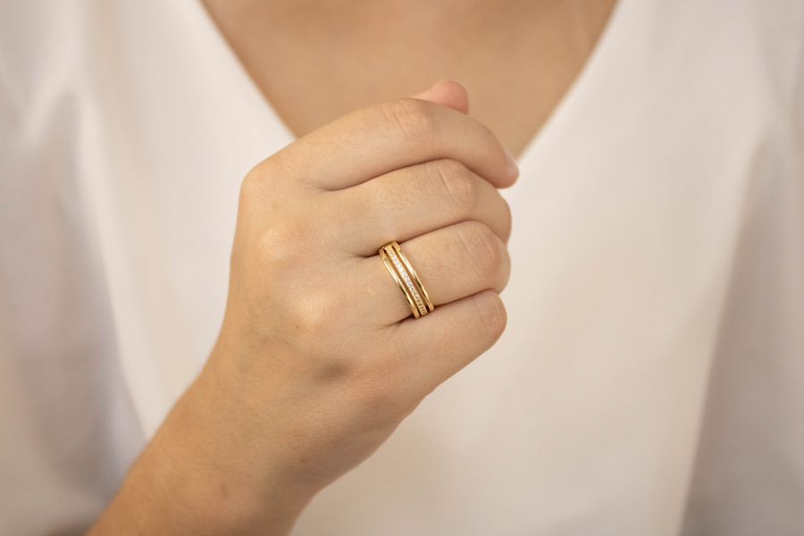 ANEL BANHADO EM OURO, ALIANÇA COM ZIRCÔNIAS BRANCAS OU PRETAS