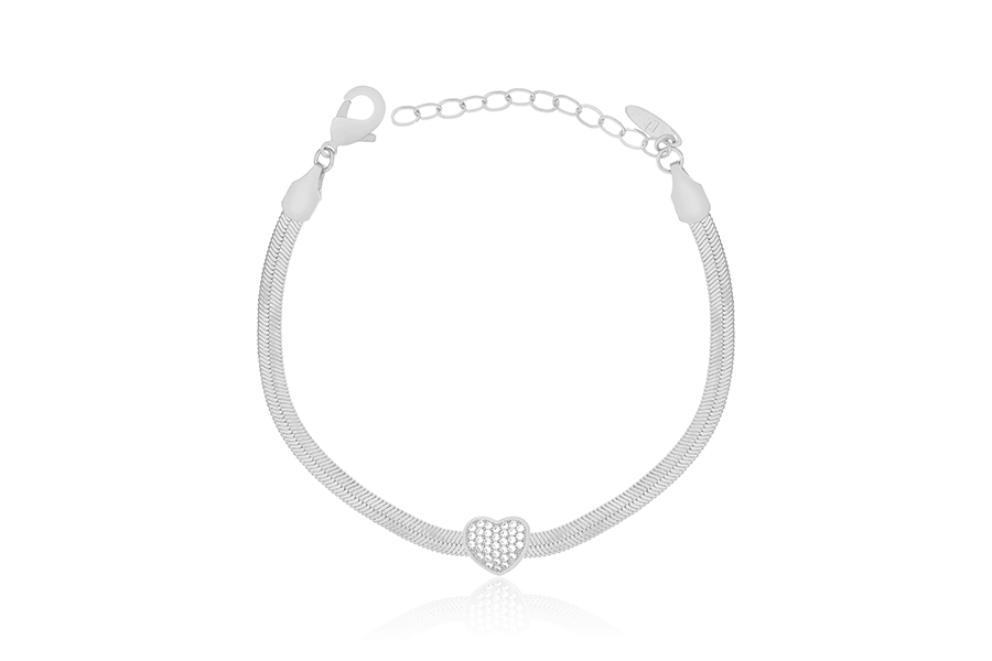PULSEIRA BANHADA EM RÓDIO BRANCO, ELO CARTIER 5,10x1,90mm, 17cm COMPRIMENTO, EXTENSOR 5cm COMPRIMENTO E PINGENTE 14mm DIÂMETRO COM CORAÇÃO DE ZIRCÔNIA