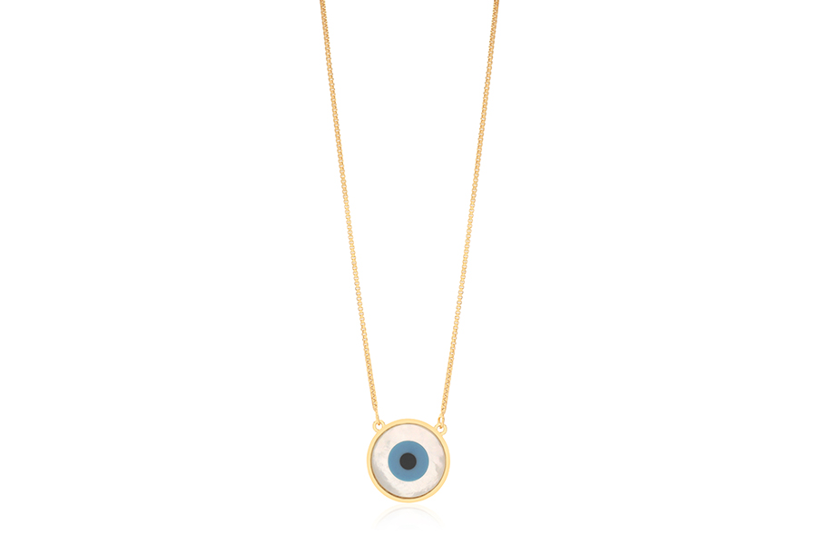 GARGANTILHA BANHADA EM OURO, VENEZIANA 0,80mm TRIPLA, CORAÇÃO 8mm LARGURA, OLHO GREGO 4mm E PONTO DE LUZ 3,50mm