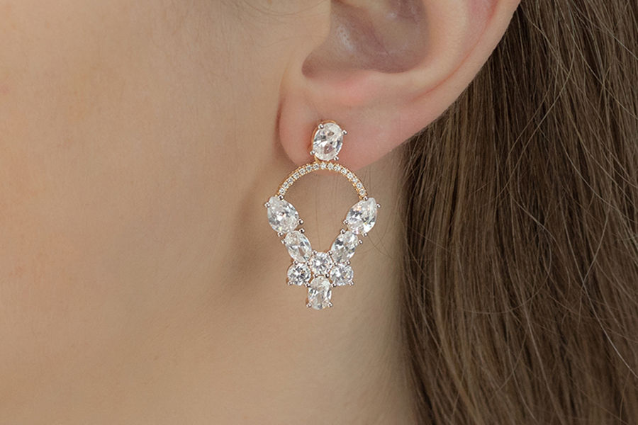 BRINCO BANHADO EM OURO, FIOS CRUZADO, COM PARTE INFERIOR E BASE CRAVEJADOS