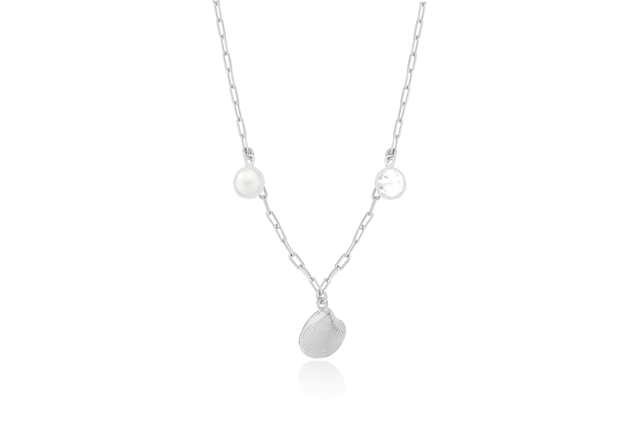 GARGANTILHA BANHADA EM RÓDIO BRANCO, ELO VENEZIANA 0,80mm, 40cm COMPRIMENTO, EXTENSOR 5cm COMPRIMENTO E PINGENTE SOJA COM PÉROLAS SHELL 3mm