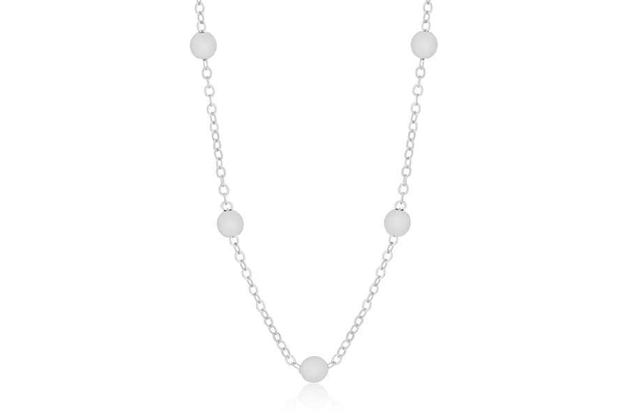 GARGANTILHA BANHADA EM RÓDIO BRANCO, ELO VENEZIANA 0,80mm, 40cm COMPRIMENTO, EXTENSOR 5cm COMPRIMENTO E PINGENTE SOJA COM PÉROLAS SHELL 3mm