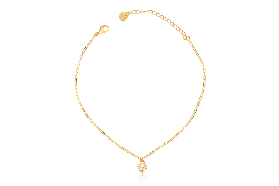 TORNOZELEIRA BANHADO EM PRATA LEVE, ELO CARTIER 3,10x1,30mm, 21cm COMPRIMENTO COM OLHO GREGO, PONTO DE LUZ, CORAÇÃO E EXTENSOR 5cm COMPRIMENTO