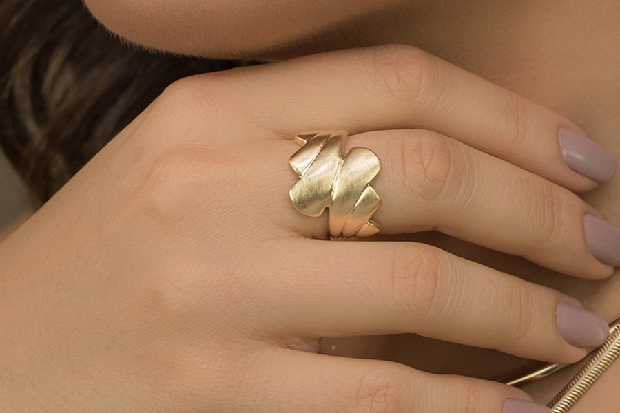 ANEL BANHADO EM OURO, CRUZADO, 15mm LARGURA
