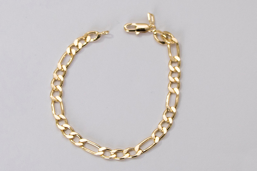 PULSEIRA BANHADA EM OURO, ELO PORTUGUÊS 2mm, 16cm COMPRIMENTO E TRÊS OLHOS GREGOS 4,50mm DIÂMETRO