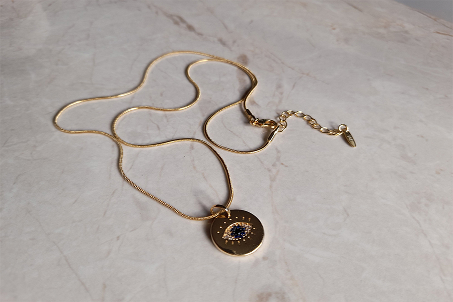 GARGANTILHA BANHADA EM OURO, VENEZIANA 0,80mm TRIPLA, CORAÇÃO 8mm LARGURA, OLHO GREGO 4mm E PONTO DE LUZ 3,50mm