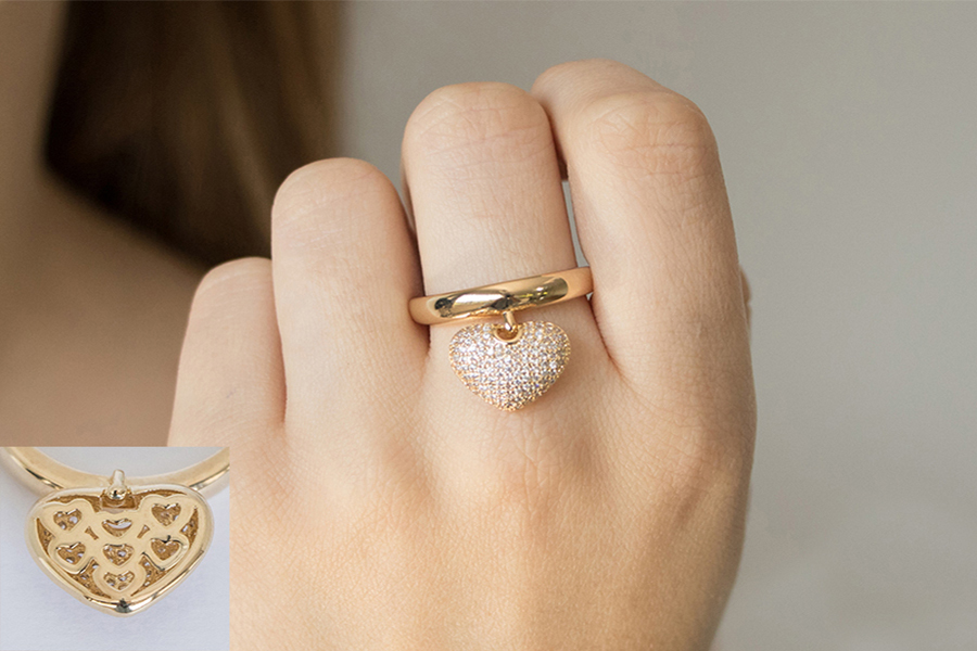 ANEL BANHADO EM OURO, CORAÇÃO COM 166 ZIRCÔNIAS, 20mm LARGURA E 18mm ALTURA