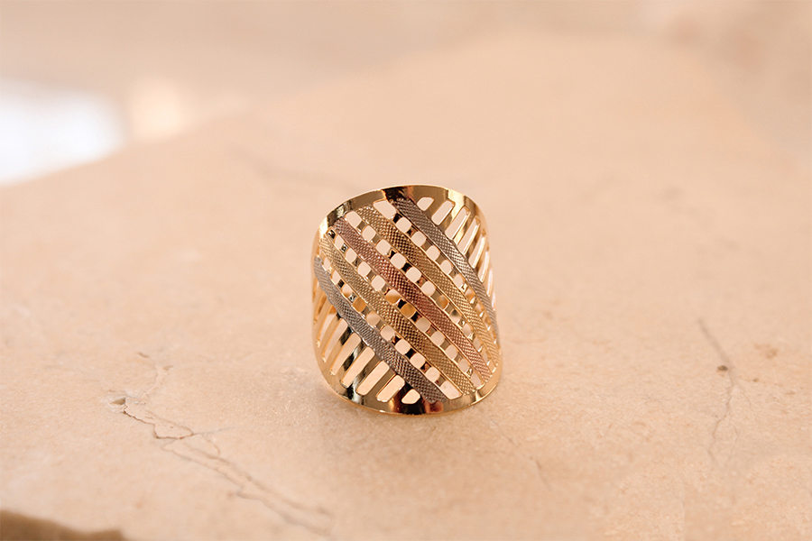 ANEL BANHADO EM OURO, TORCIDO, COM RESINA COLORIDA