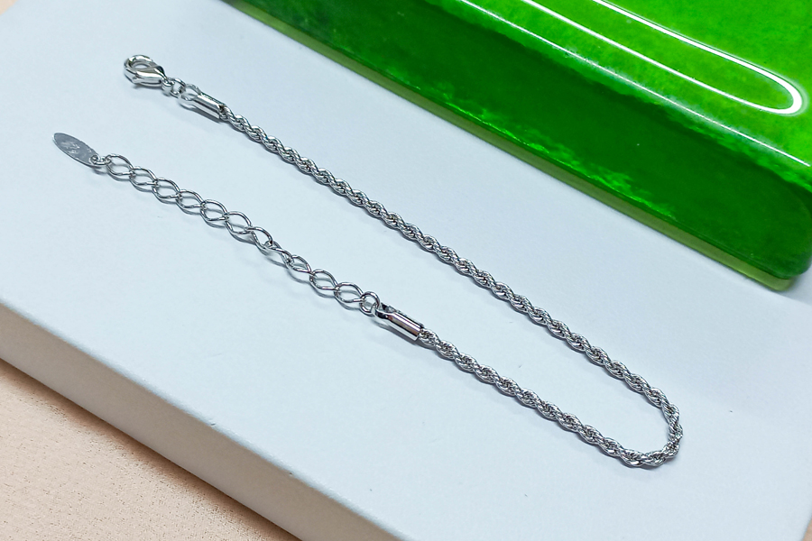PULSEIRA BANHADA EM RÓDIO BRANCO, ELO PORTUGUÊS 5mm DIÂMETRO, 16cm COMPRIMENTO, EXTENSOR 5cm COMPRIMENTO E PONTO DE LUZ 8mm